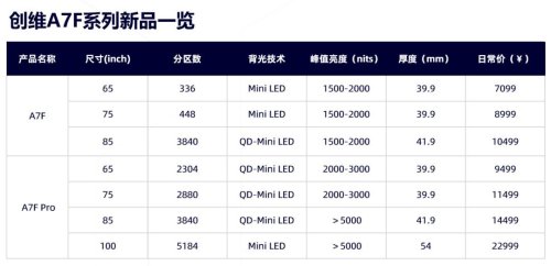 A7F 系列电视:提供65吋、75吋、85吋三种规格,分别为336分区、448分区、3840分区,8999元起;