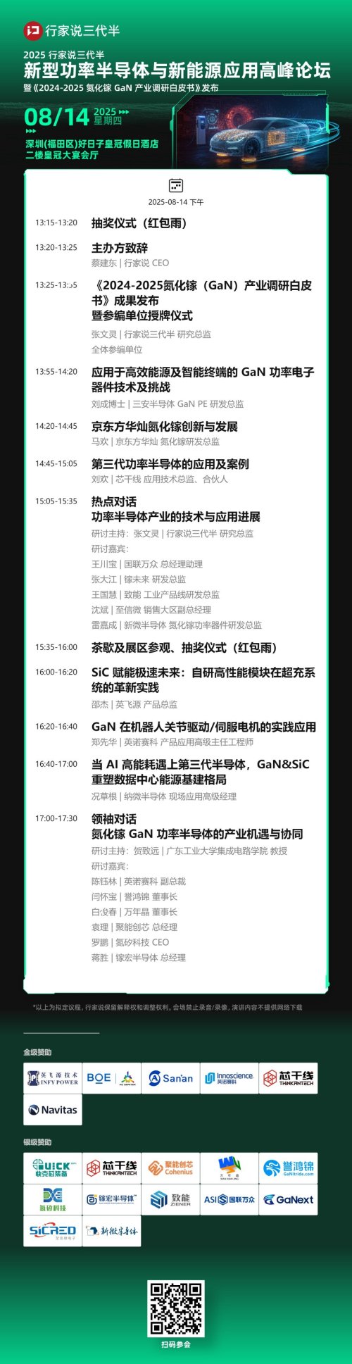 与此同时,为更深刻地洞察氮化镓的车规应用进展,行家说“新型功率半导体与新能源应用高峰论坛”将于8月14日在深圳举办,届时将邀请到英诺赛科、三安半导体、京东方华灿、誉鸿锦、万年晶半导体、镓宏半导体、致能、纳微半导体等众多GaN代表厂商分享其在氮化镓等方面的创新成果,将为产业链上下游提供前沿技术参考和多元协作路径。