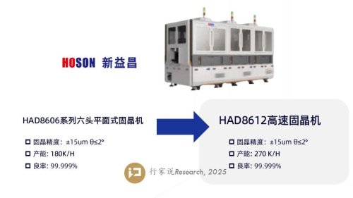 今年,新益昌在其HAD8606系列六头平面式固晶机的基础上,完成了新一代高速固晶机的研发,进一步推出了HAD8612高速固晶机,其固晶精度达到±15um内,θ≤±2°,产能达270K/H,良率达99.999%,能够更好地满足客户日益精进的高速高精度要求。