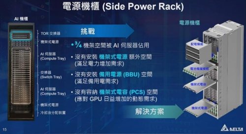 据台达电子分析,在高算力数据中心中,AI服务器的体积越来越大,将占据75%的机柜空间,留给PSU电源架、备用电源(BBU)和机架电容(PCS)等设备的空间严重不足,为此需要采用“边柜(Sidecar或Side Rack)”方案,将PSU、BBU等设备移出到单独的机柜中。