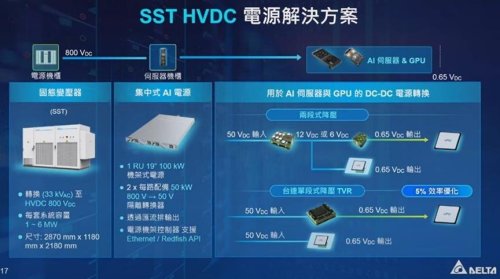 但是从英伟达和台达的技术发展路线图来看,“边柜”方案可能是过渡性方案。因为英伟达公布的800V架构是在2027年实施,并将回到集中式电源机柜方案,即通过模块化固态变压器(SST)机柜和HVDC服务器电源,将800V直流电压在机架级降至50V直流母线电压。