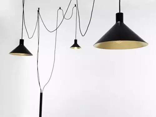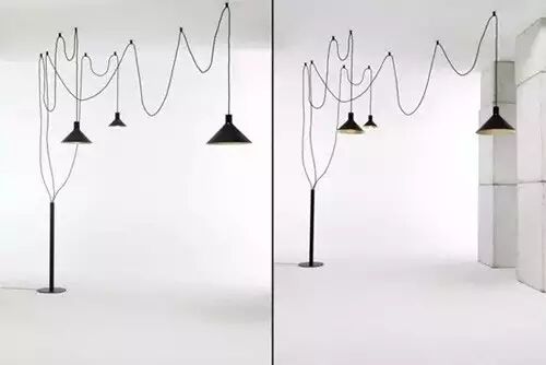这是一款既有装饰效果又具功能性的创意吊灯,落地的直筒灯座中延伸出三条长长的电源线连接三盏吊灯。