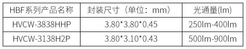 HVCW-3838HHP和HVCW-3138H2P,采用QFN封装形式,使用精密的封装技术,能够实现均匀的光分布和指定的明暗边界。 这两款产品适用于所有车辆的大功率灯具上,它不仅仅能用于带导光板的日间行驶灯,而且广泛应用于近光灯、远光灯、雾灯、弯道辅助照明。
