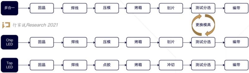 接下来看看SMD灯珠与IMD的工艺流程。下图来自行家说《小间距LED调研白皮书》,可以看到,SMD灯珠与IMD的工艺流程类似,依次为固晶、焊线、压模、烤箱、划片、测试分选、编带。通过2021白皮书调研了解到,SMD灯珠所需设备与IMD基本一样,不同之处在于后段工艺的测试分选设备。IMD工艺由于是四个像素或两个像素集成为单颗灯珠进行封装,分光分色是一大难点。为了更高的测试参数需求,IMD工艺的测试分选环节需对测试分选设备更换模块。
