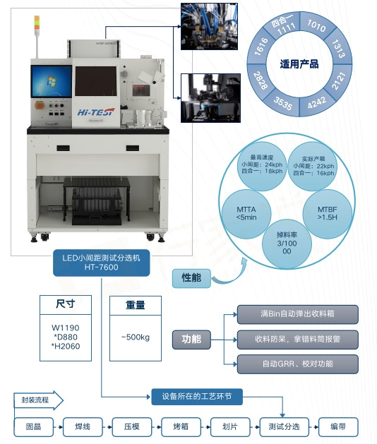 SMD灯珠与IMD产线的工艺流程和相关设备基本一样,切换产品产能的关键在测试分选机。为了满足封装客户灵活切换产能的需求,华腾半导体推出了IMD与分立器件兼容的HT7600测试分选机,为独家专利产品。