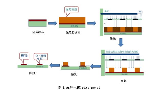 1.利用沉淀形成gate metal。首先在玻璃基板上涂布一层金属,然后涂上光阻胶,最后通过暴光、显影、蚀刻和除胶而形成gate metal。涂布的金属材料主要成分为:钛(TI)、铝(AL)、钼(MO)和铬(CR)以及其混合物。