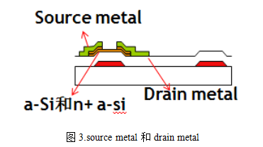 3.形成source metal和drain metal。首先在a-si上涂布一层金属材料来作为source metal和drain metal,然后在金属材料上涂布光阻胶并通过暴光、显影、蚀刻和除胶而形成所需形状。Source metal和drain metal主要成分为:钛(TI)、铝(AL)、钼(MO)和铬(CR),这与gate metal相同。