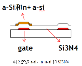 2.沉淀SI3N4(氮化硅)、a-SI(非晶硅)和N+a-si(N型硅)。首先利用PECVD ( Plasma Enhanced Chemical Vapor Deposition ) 技术分别涂布一层SI3N4、N+a-si和a-si,然后在N+a-si和a-si上涂布光阻胶,通过暴光、显影、蚀刻和除胶而形成所需形状。PECVD指的是等离子体增强化学气相沉积法,原理是借助微波或射频等使含有薄膜组成原子的气体电离,在局部形成等离子体,而等离子体化学活性很强,很容易发生反应,在基片上沉淀出所期望的薄膜。 SI3N4、N+a-si和a-si三种材料充当的角色分别为:gate端和液晶存储电容的电解质、N型半导体和P型半导体。