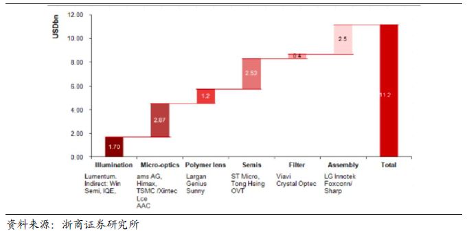 3D Sensing 产业链相关零部件对应市场规模