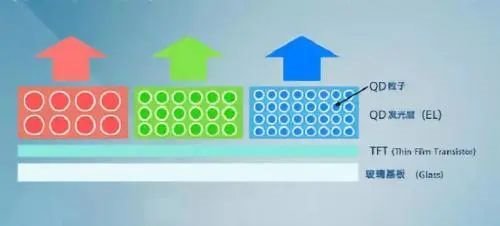 最后是将量子点作为自发光材料来使用的方式。不同于上述三种技术,这种方式是由量子点材料组成的 RGB 子像素在电流作用下自己发光。发光结构与普通 OLEO 相似,区别是发光物质由有机物变成了无机物量子点。