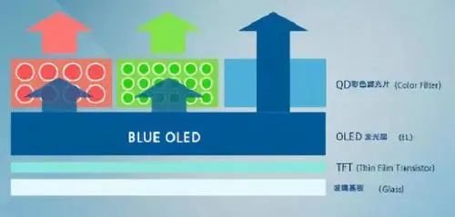 目前学术界正在讨论量子点与 OLED 技术相结合的方式。这项技术将 OLED 的蓝色作为背光源,光穿过由量子点组成的红色和绿色滤光片表现所需颜色。如上所述,量子点粒子中的蓝色粒子最小,很难控制,因此在尽可能保持高纯度蓝色的同时,用红色和绿色来发挥量子点的优势。