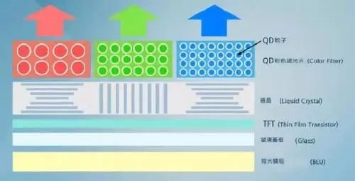 量子点膜方式已经实现商用化,在 LCD 添加量子点膜,可以提高画质。如图所示,将含有量子点粒子的膜插入背光模组(BLU)上面,穿过这个膜的光通过液晶和彩色滤光片表现所需颜色。