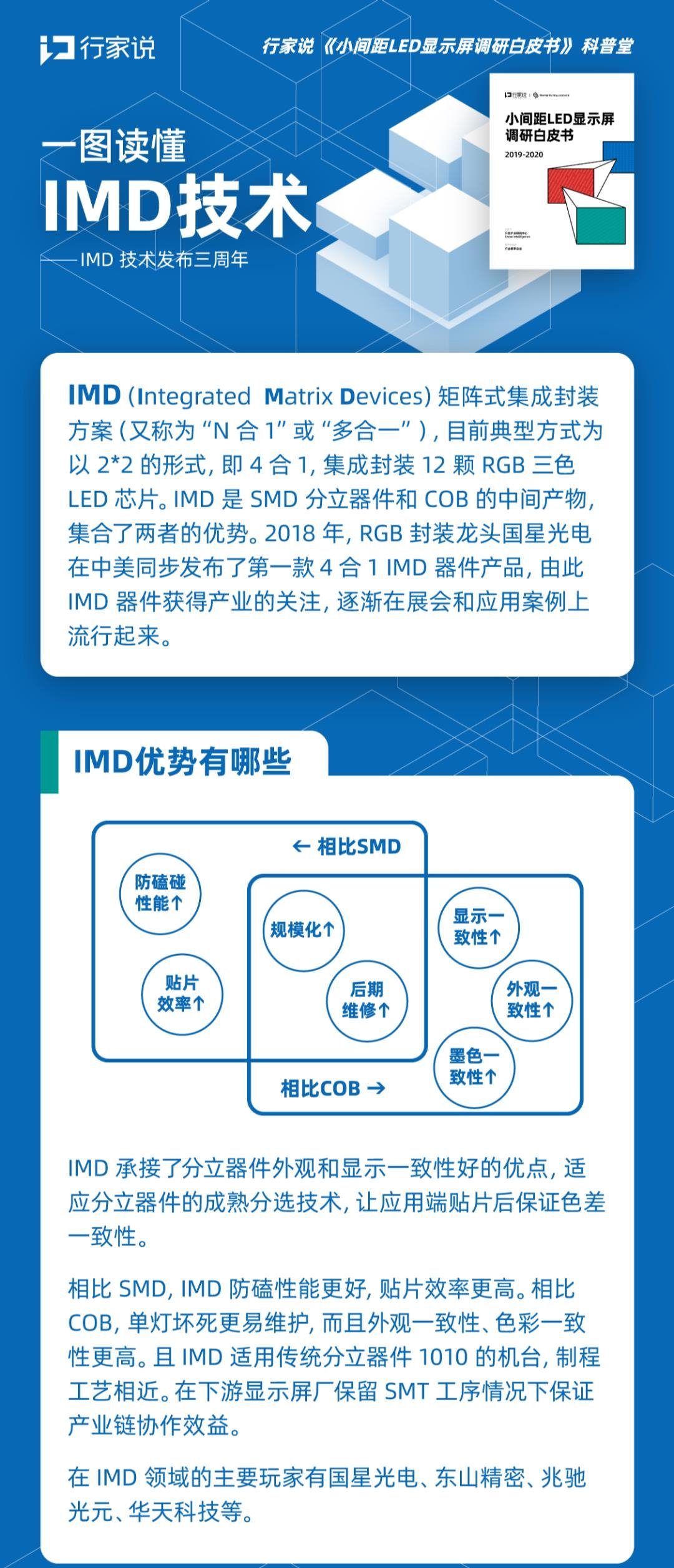 IMD(Integrated Matrix Devices)矩阵式集成封装方案(又称为“N合1”或“多合一”),目前典型方式为以2*2的形式,即4合1,集成封装12颗RGB三色LED芯片。IMD是SMD分立器件和COB的中间产物,集合了两者的优势。2018年,RGB封装龙头国星光电在中美同步发布了第一款4合1 IMD器件产品,由此IMD器件获得产业的关注,逐渐在展会和应用案例上流行起来。