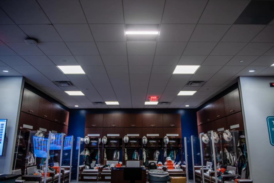 Healthe已在迈阿密海豚橄榄球队的更衣室内的吊顶以及其他设施中安装了约40个2 × 2英尺的该固定装置。